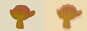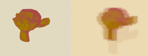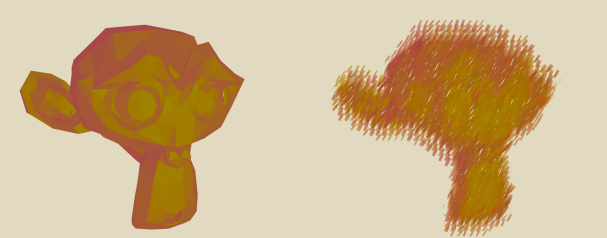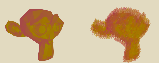 As you can see, this resulted in some strange shadow-like artifacts on the final render. This effect was particularly apparent with larger brush sizes. I found that the problem came from some brushstrokes in the lower right having a majority of the brush stroke quad with the background color value, but one or two values of the object itself. This resulted in a blended color between the two for a brush stroke. A somewhat poor solution to this problem, I simply discarded all fragments that had a color close to the background color.
