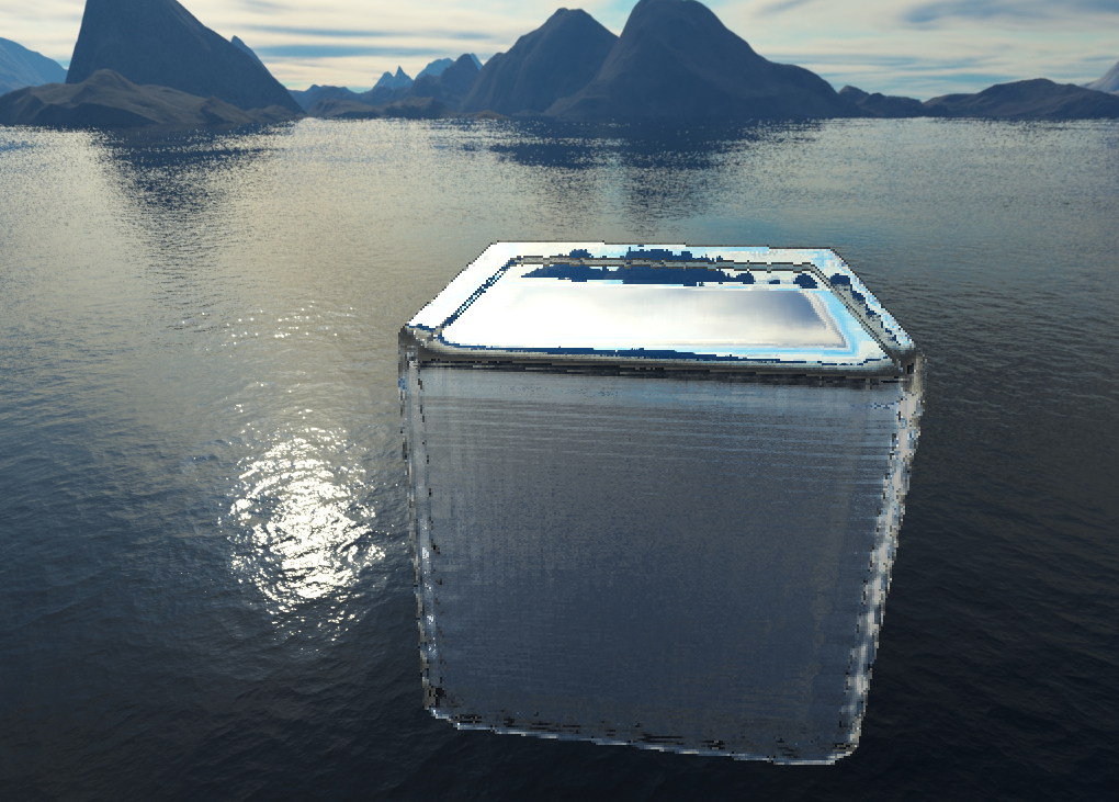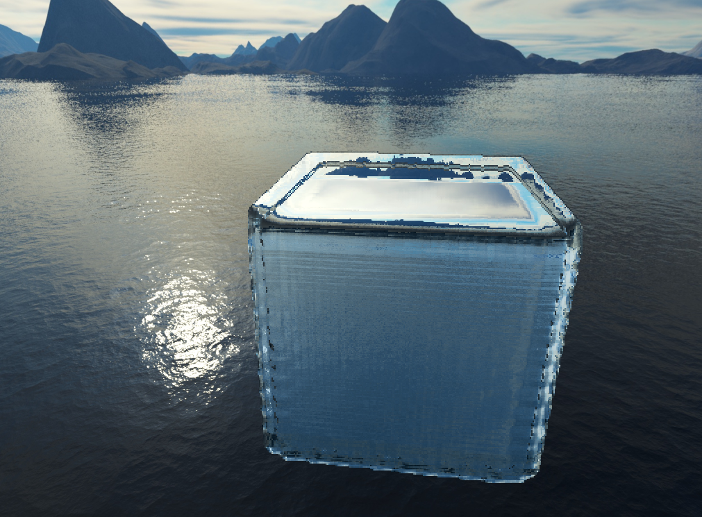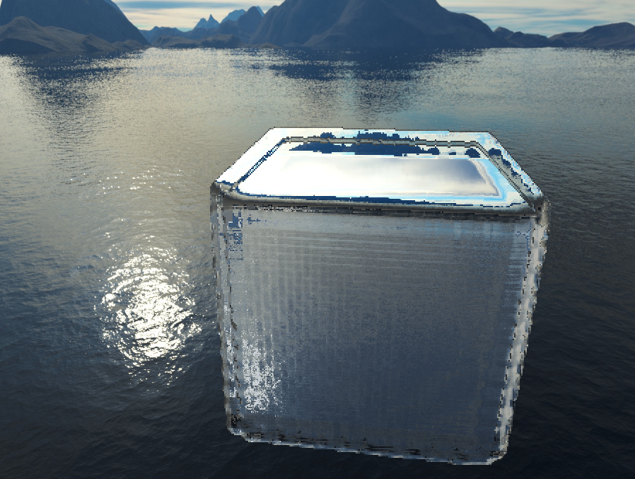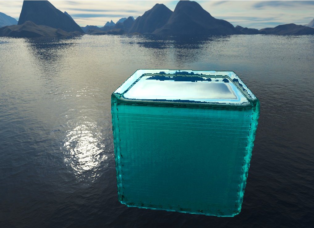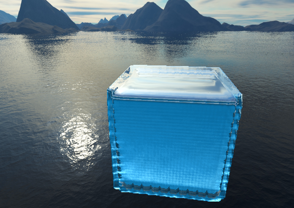 The second fix, which solved the artifacts at the edge of the cube came when I examined the pictures above. The problem clearly came from blending, but the Gaussian filter was being applied properly. The actual problem was it was blending the background color of the image with the normals of the water. This was a fairly simply fix, simply ignoring any normals from the background which shouldn't be considered anyways. With that, you can see a big improvement to the render.