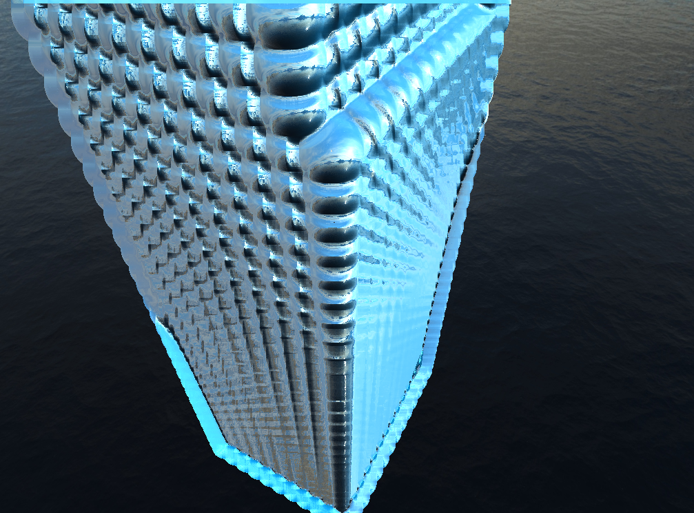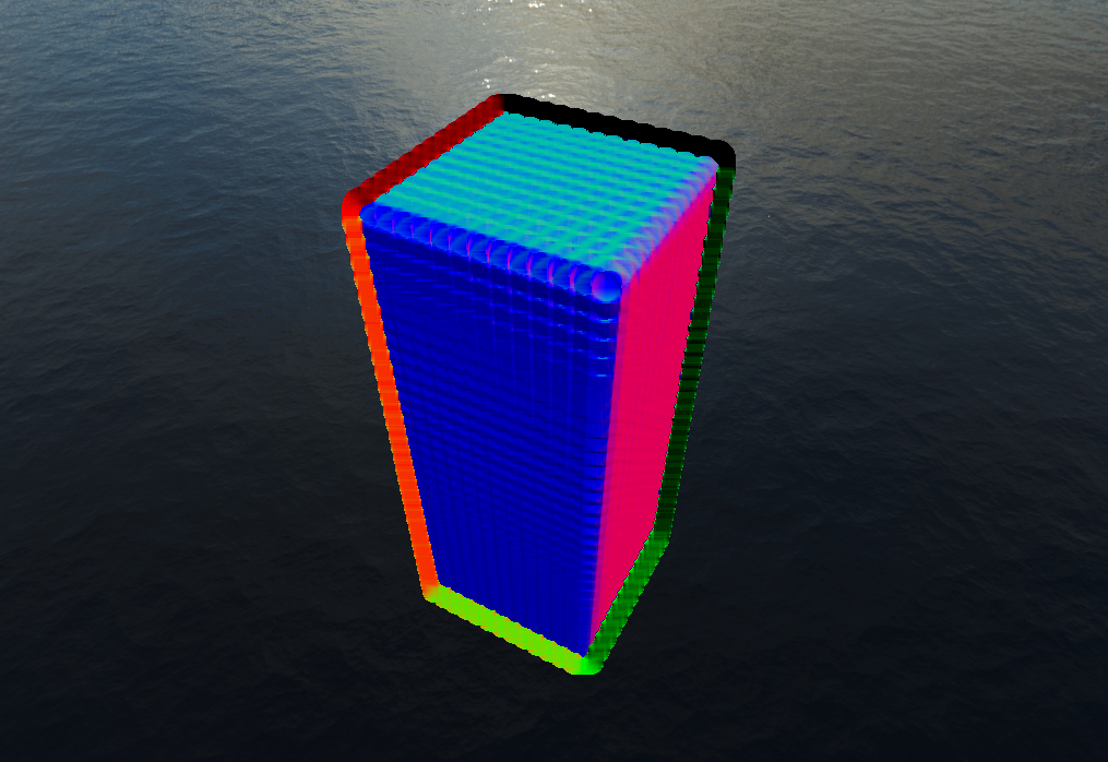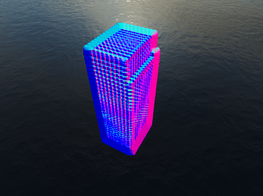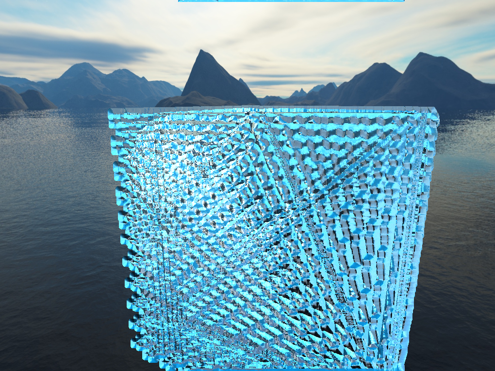 The second fix, which solved the artifacts at the edge of the cube came when I examined the pictures above. The problem clearly came from blending, but the Gaussian filter was being applied properly. The actual problem was it was blending the background color of the image with the normals of the water. This was a fairly simply fix, simply ignoring any normals from the background which shouldn't be considered anyways. With that, you can see a big improvement to the render.