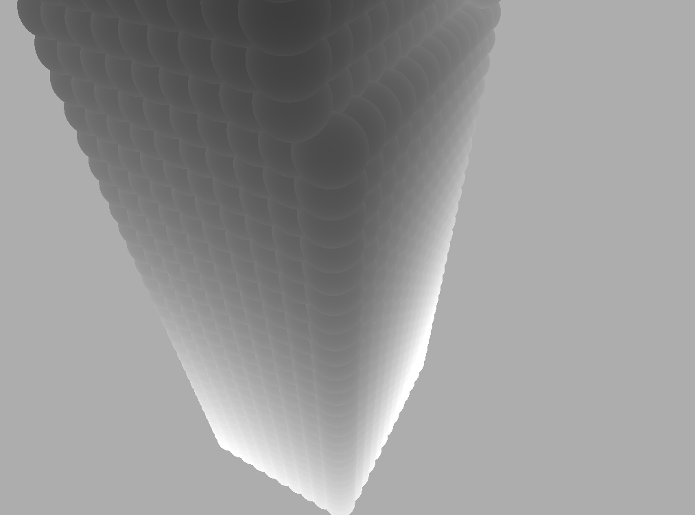 In the first step, we need to render particle sprites at the positions of each particle. The positions are stored in a 2D texture for simulation on the GPU, so we take in the particle ids as UVs rather than positions in the rendering shader. I used GPU instancing for rendering the sprites since each particle renders the same 2D, screen-space quad just at different positions on the screen. Rendering the depth, we can see the result below.